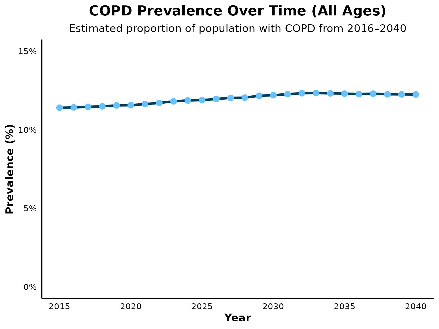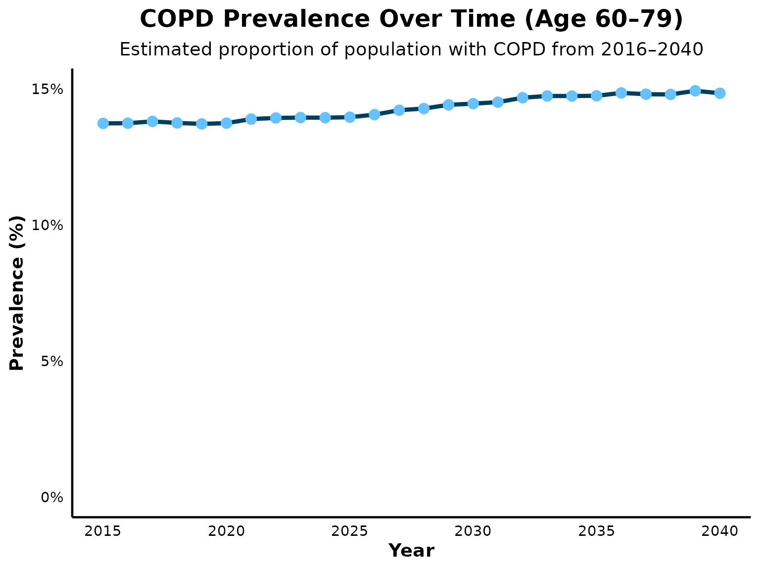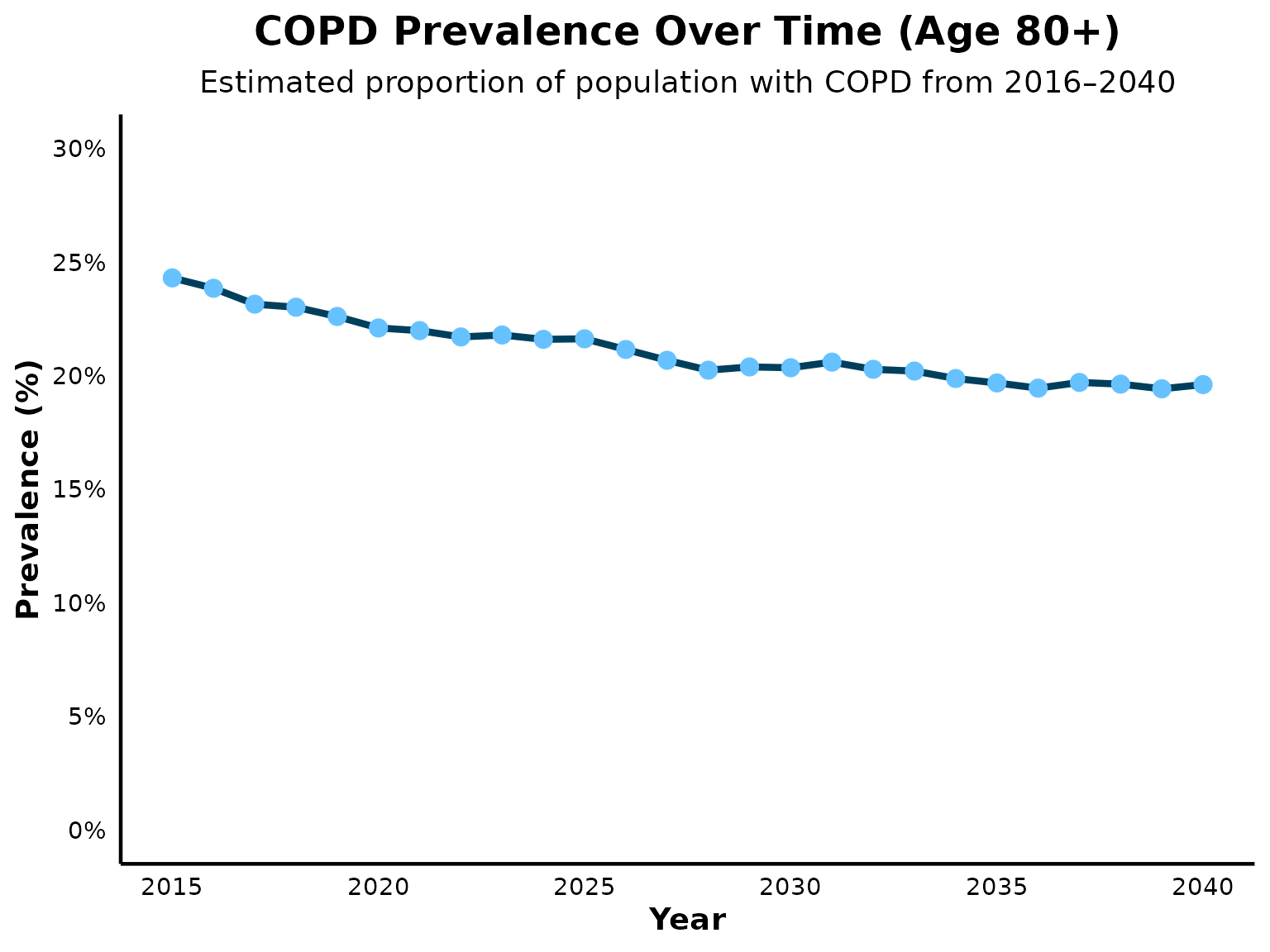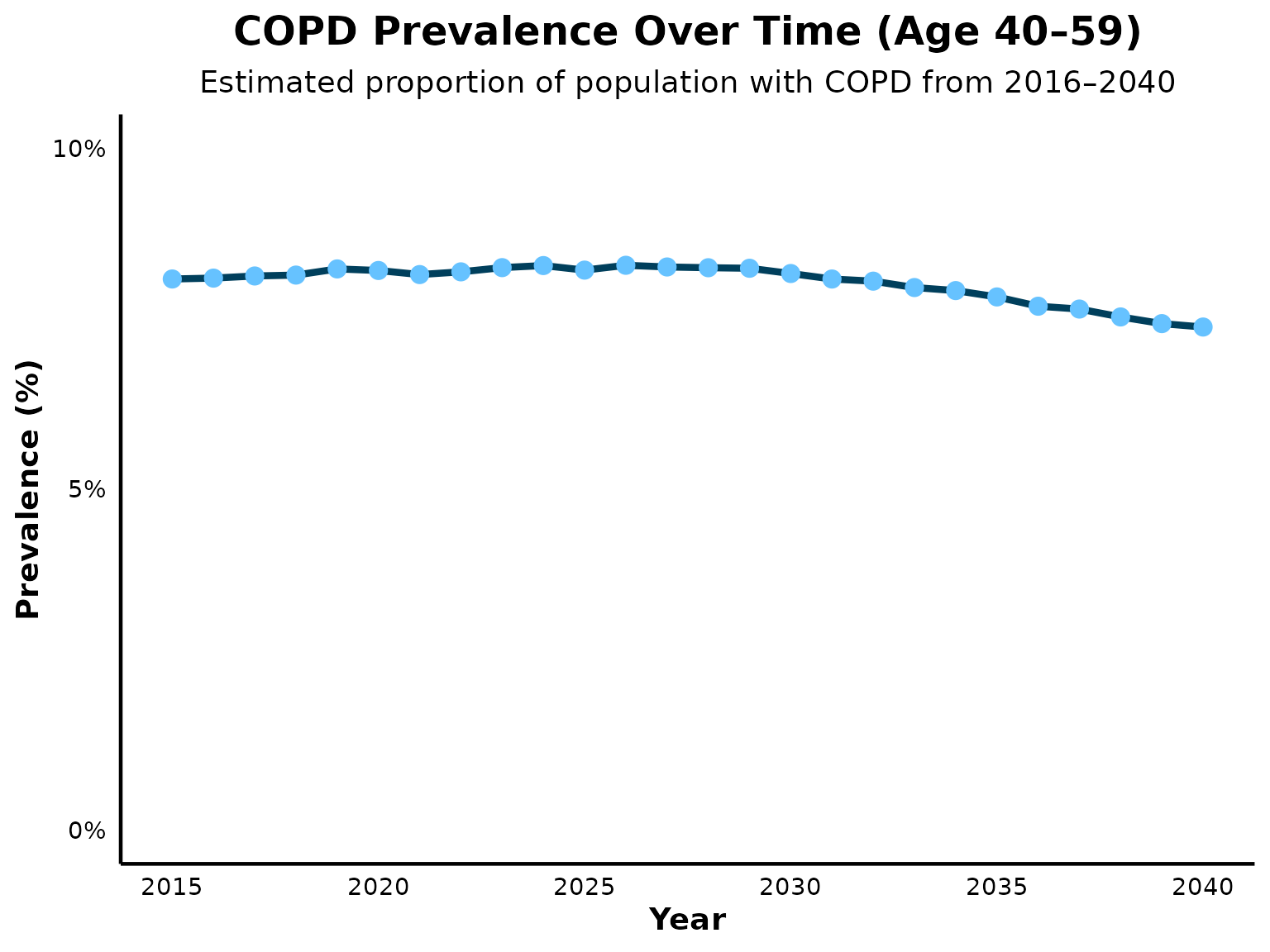 COPD prevalence is projected to decline moderately between 2025 and 2050, as reported by Boers et al. 2023 (DOI: 10.1001/jamanetworkopen.2023.46598). A similar trend is observed in EPIC model projections of overall COPD prevalence. However, a limitation of EPIC include underestimating the size of the population aged 80 and older. As COPD prevalence increases with age, this results in a overestimation of overall COPD prevalence in the simulated population.