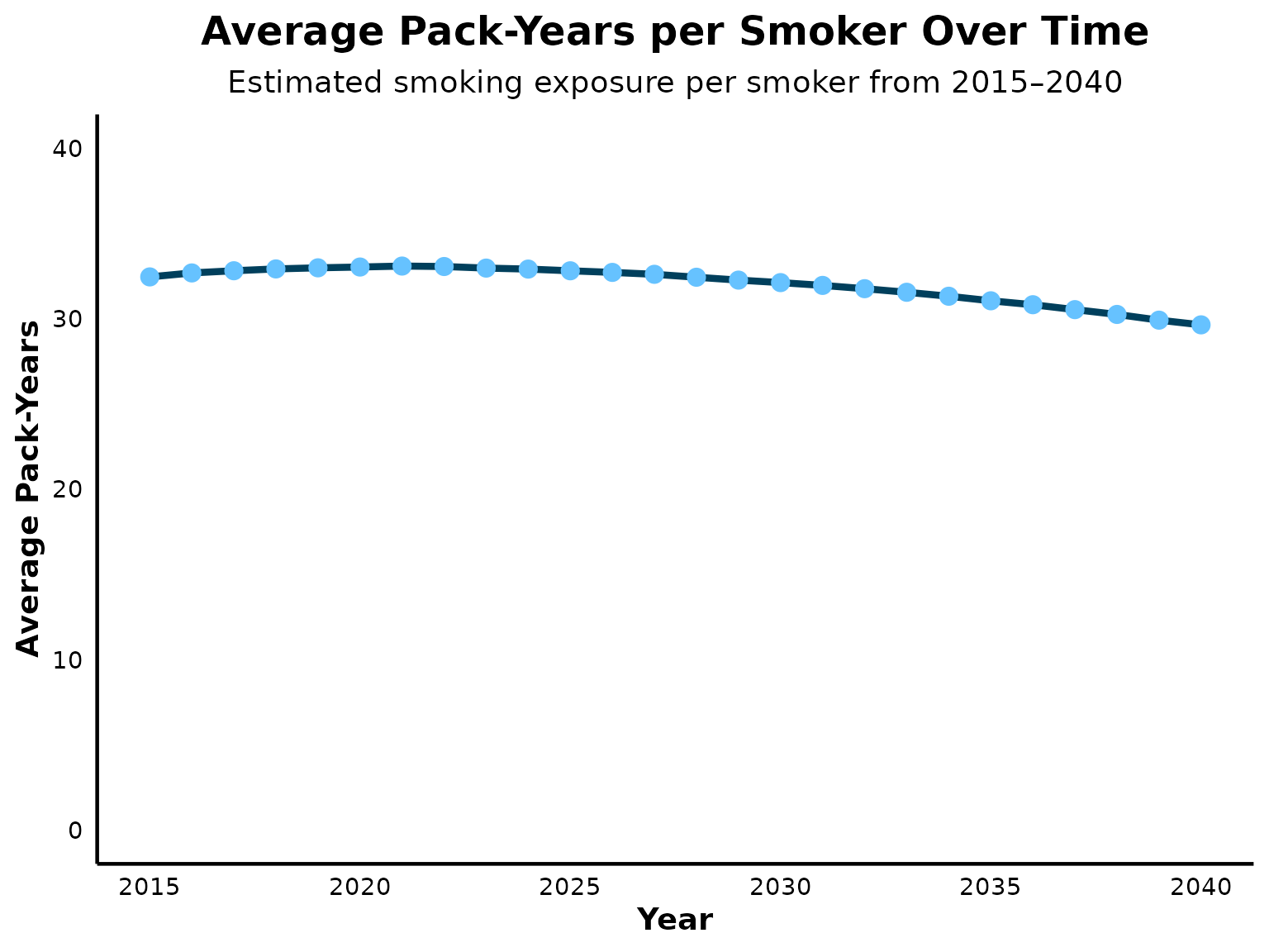 These data reflect a broader shift toward lower daily cigarette consumption, suggesting that, on average, smokers are now consuming approximately half to one pack per day. In light of this, a projected decline in cumulative pack-year exposure is both expected and reasonable. The observed decrease in average pack-years per smoker in the model is therefore aligned with empirically documented reductions in smoking intensity, supporting the face validity of the simulated trend.