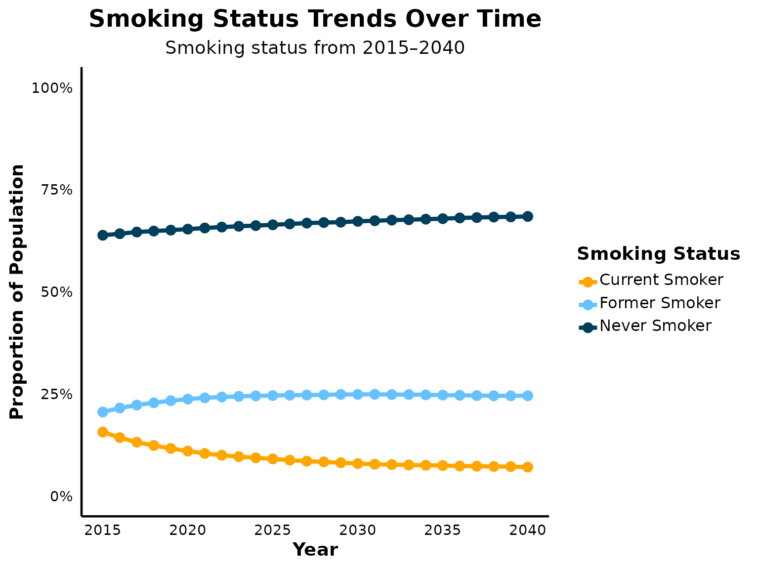 To project the future decline in the prevalence of cigarette smoking among U.S. adults aged 40 and over after 2023, historical data from the 2025 MMWR report (DOI: 10.15585/mmwr.mm7407a3) was used. In 2017, the number of exclusive cigarette smokers was estimated at 11.0 million for adults aged 45–64 and 3.57 million for those aged 65 and older, totaling 14.57 million. By 2023, these figures declined to 8.77 million and 4.20 million, respectively, resulting in a combined total of 12.97 million smokers aged 45 and over. The AAPC was calculated using the formula: AAPC = ((Value 2023 / Value 2017) ^ (1/6)) - 1. This resulted in an estimated AAPC of –1.9% per year. This historical trend was then applied to model the projected year-over-year decline in smoking prevalence beyond 2023.